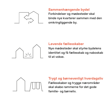 Her udvikles et nyt levende kvarter med intime og trygge gaderum, hvor der er plads til leg på gaderne, og hvor naboer mødes til en snak.